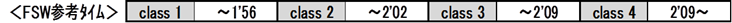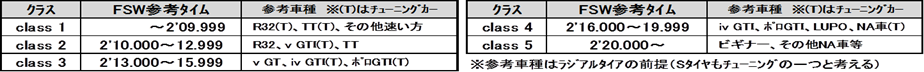 | ▼クラス分け: エントリークラスは基本的に自己申告とし(協力店にご相談下さい)、下記から参考タイムにより決めて下さい。 |